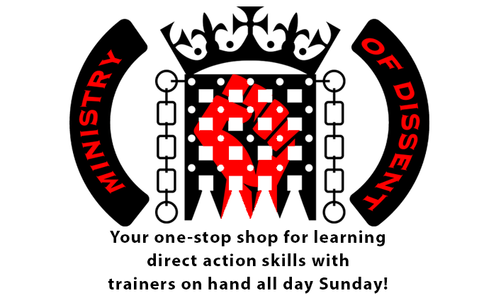 Our ‘Ministry of Dissent’ is your one-stop shop for learning direct action skills with trainers on hand all day Sunday |